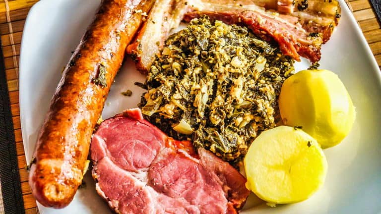 regionaler Grünkohl mit Kasseler, Wurst und Kartoffeln und ein Verdauungsschnaps (Kümmel)